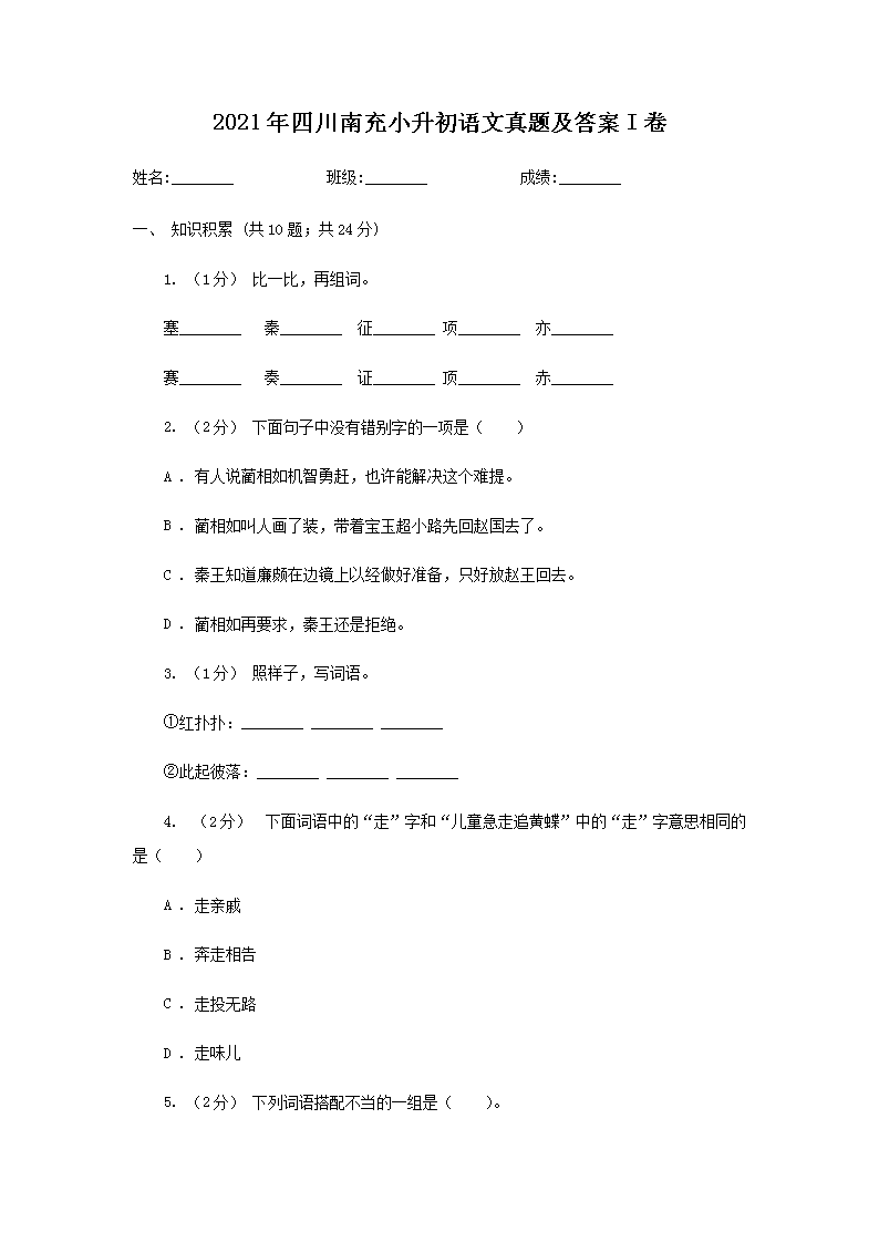 【文档预览】 文档大全网整理发布2021年四川南充小升初语文真题及答案I卷(Word版),前五页预览如下: