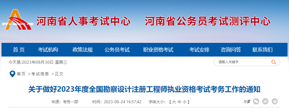 【#给排水工程师# 导语】©文档大全网从河南省人事考试中心获悉,《2023年河南勘察设计注册工程师执业资格考试报名通知》现已发布,2023年河南给排水工程师报名时间:8月30日-9月6日,考试时间:11月4日-5日,©文档大全网小编现将报考信息发布如下: