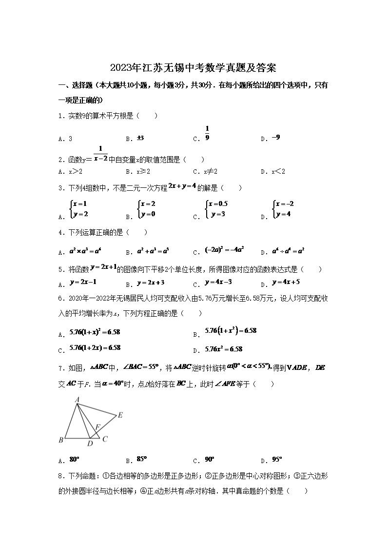 【文档预览】 文档大全网整理发布2023年江苏无锡中考数学真题及答案(Word版),前五页预览如下: