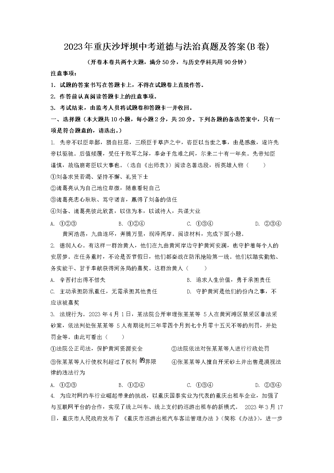 2023年重庆沙坪坝中考道德与法治真题及答案(B卷)(Word版)06-19
