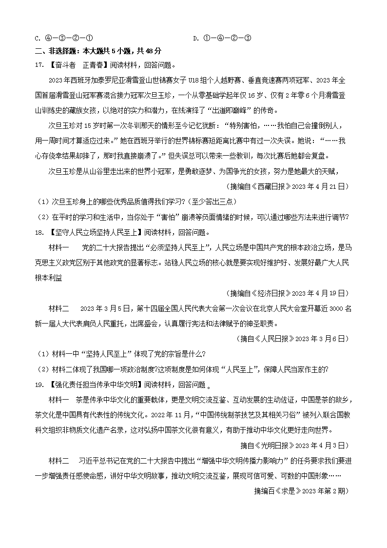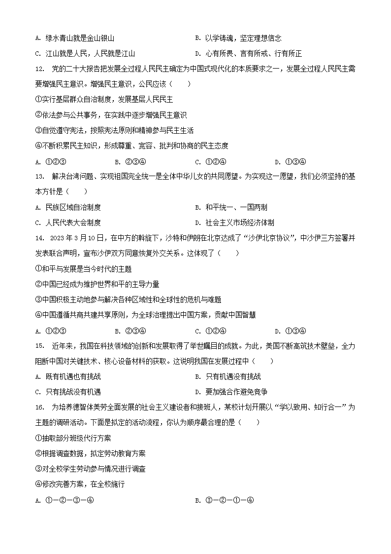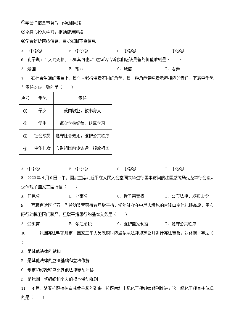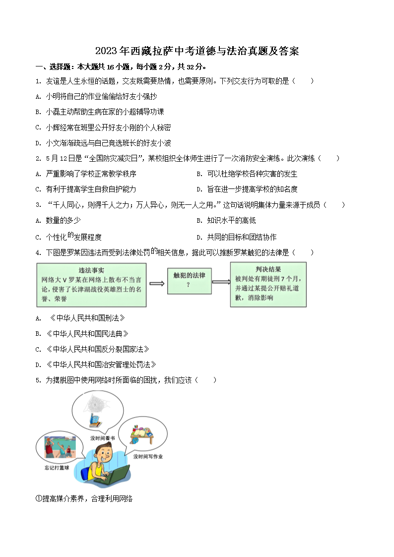 2023年西藏拉萨中考道德与法治真题及答案(Word版)10-14