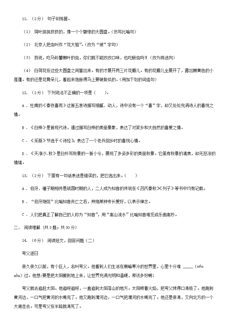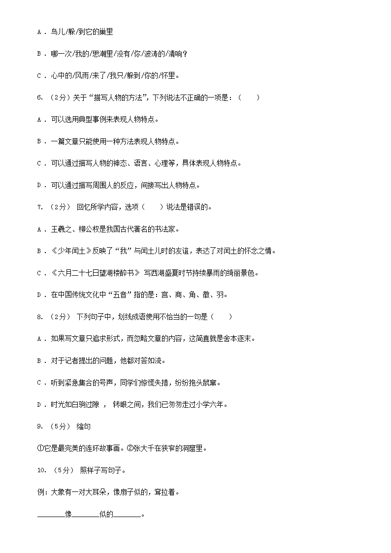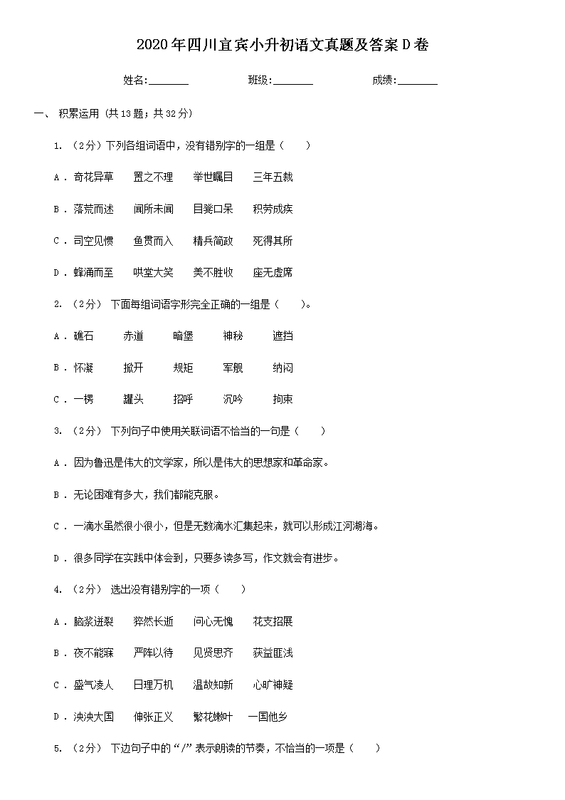 2020年四川宜宾小升初语文真题及答案D卷(Word版)09-29