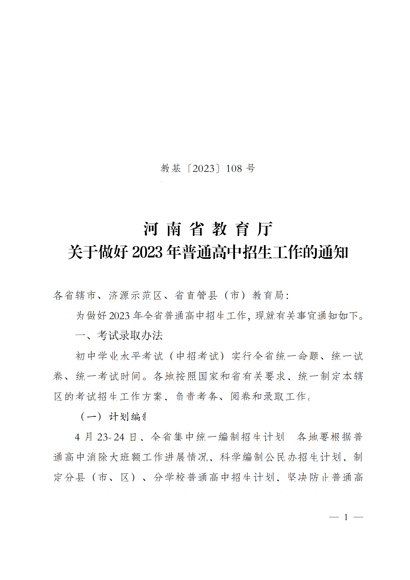 现将《河南省教育厅关于做好2023年普通高中招生工作的通知》(教基〔2023〕108号)转发给你们。加强普通高中招生管理,规范招生秩序,关系到千家万户的切身利益,是办好人民满意教育的重要方面,各单位要高度重视,认真学习通知精神,结合实际抓好工作落实。