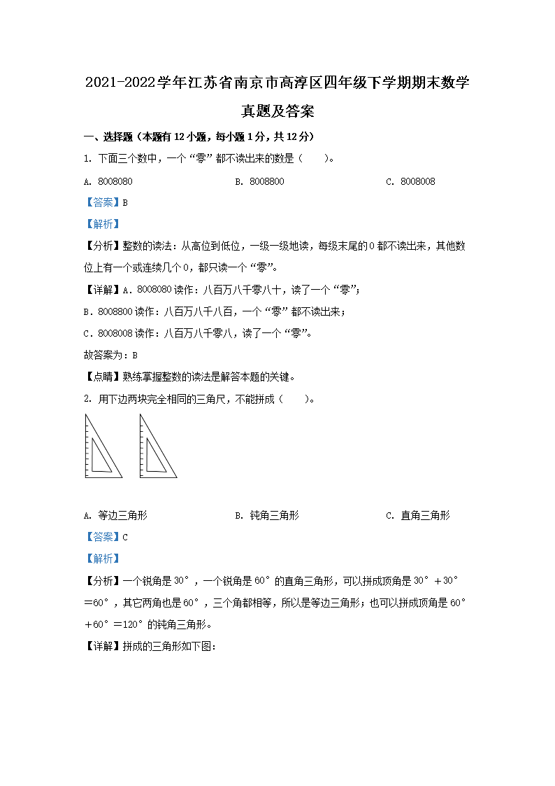 2021-2022学年江苏省南京市高淳区四年级下学期期末数学真题及答案(Word版)07-14