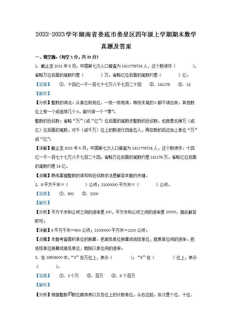 2022-2023学年湖南省娄底市娄星区四年级上学期期末数学真题及答案(Word版)10-12