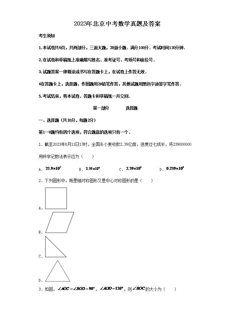 【文档预览】 文档大全网整理发布2023年北京中考数学真题及答案(Word版),前五页预览如下: