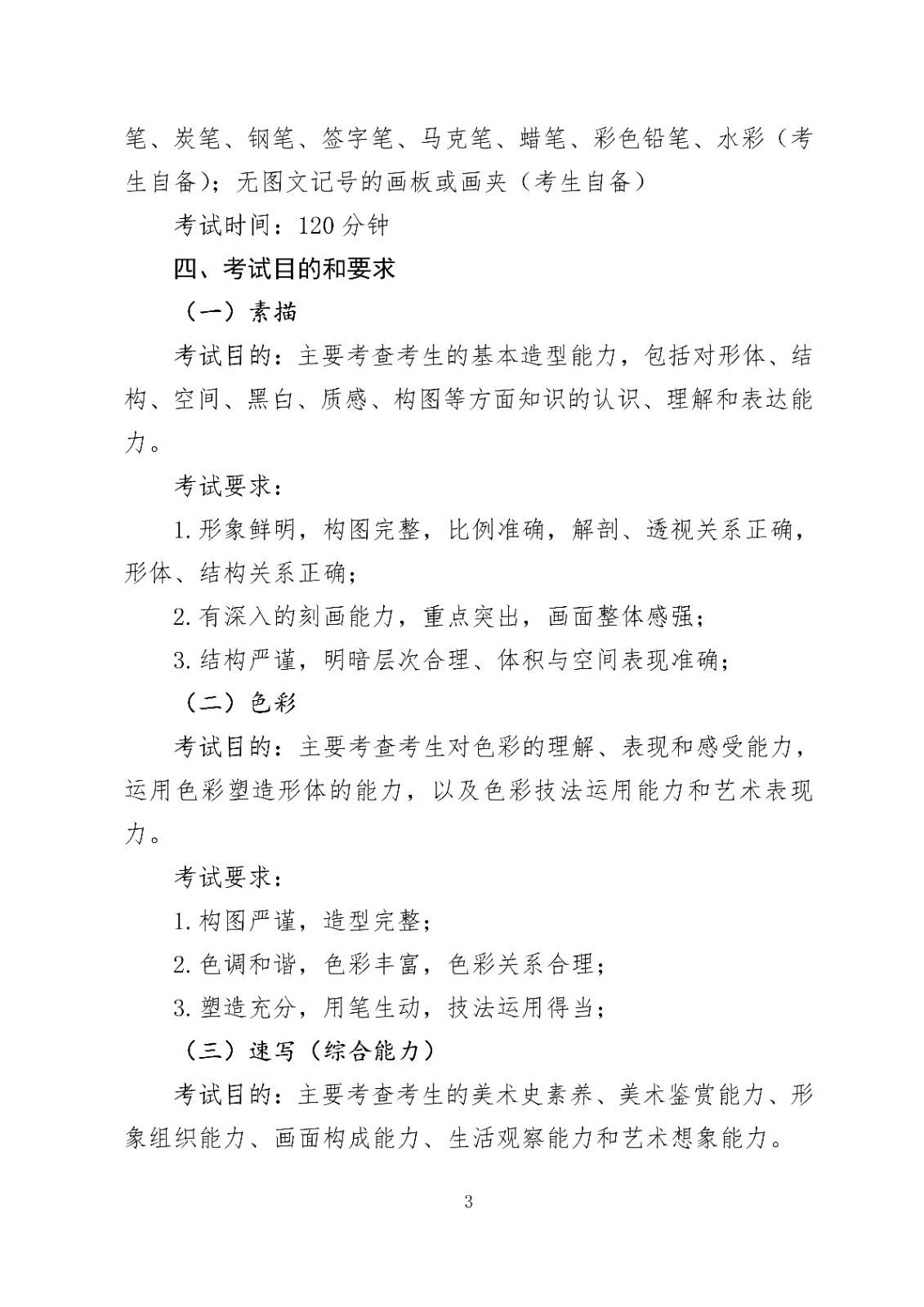 考试包括素描、色彩、速写(综合能力)三个科目。