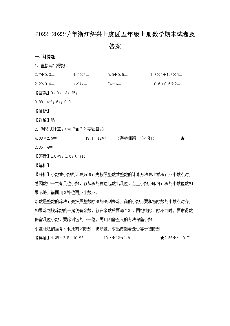 2022-2023学年浙江绍兴上虞区五年级上册数学期末试卷及答案(Word版)09-16