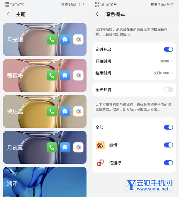 部分功能显得略显简单:深色模式就没有提供更贴合实际使用的“日落或日出”开关选项,深色档位仅有一个而且支持允许独立开关的应用也偏少;承担起负一屏的“智慧助手·今天”看起来很像万能卡片,但不能添加到桌面;桌面下滑只能是打开搜索,没有改为展开通知栏的选项。