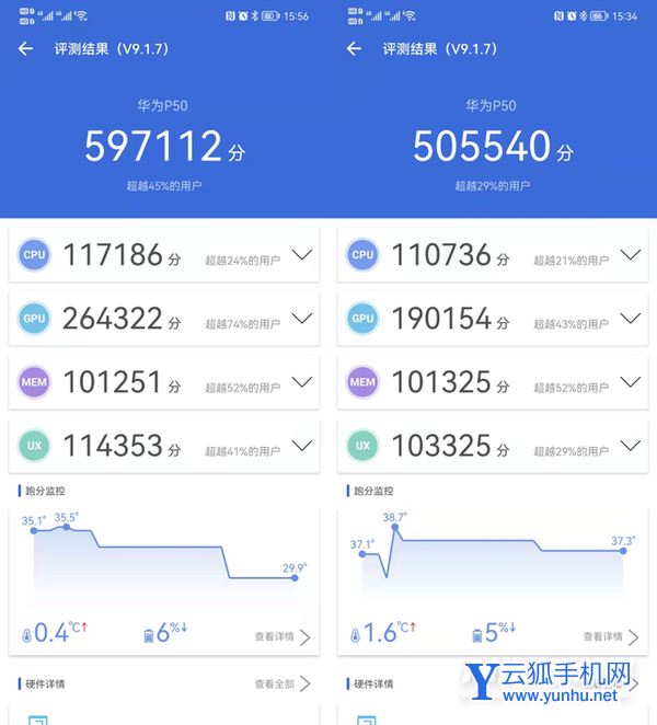 从跑分中可以看出来,华为在P50上采用了体验大于极限性能释放的调度策略:安兔兔评测 v9.1.7成绩是60万分上下,重复跑分更是会降到50万分水平,和骁龙888手机主流的70万分~80万分形成了明显差距。控制得如此严格,倒也让应用内显示的手机温度始终没超过38℃。