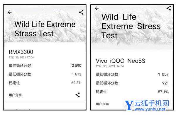 除了GPU性能,骁龙8 Gen 1在发热控制上实在是惨不忍睹,我们将这台手机进行了3DMark的20分钟循环压力测试,iQOO Neo5S的循环稳定性为87.1%,而realme GT2 Pro的稳定性只有62.3%,第1次循环测试和第14次循环测试之间,差距约有0.5倍,可见其发热降频的严重。