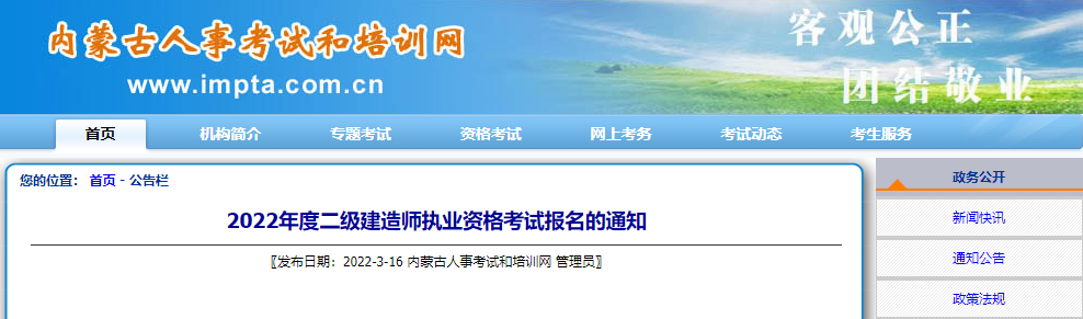 【#二级建造师# 导语】©文档大全网从内蒙古人事考试和培训网获悉,2022年内蒙古二级建造师报考工作现已开始,报名时间:3月21日-30日,考试时间:6月11日-12日,更多事宜请参考阅读《考务通知》,官方公告原文如下: