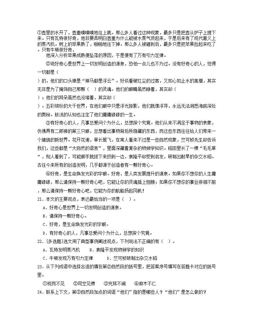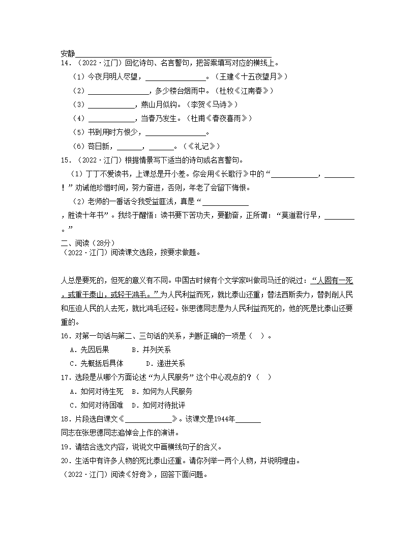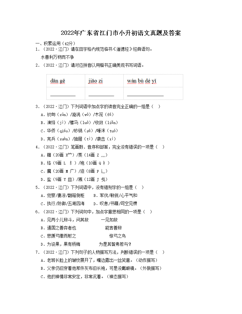 2022年广东省江门市小升初语文真题及答案(Word版)05-31