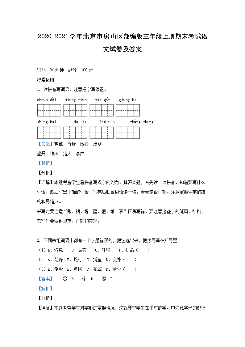 【文档预览】 文档大全网整理发布2020-2021学年北京市房山区部编版三年级上册期末考试语文试卷及答案(Word版),前五页预览如下: