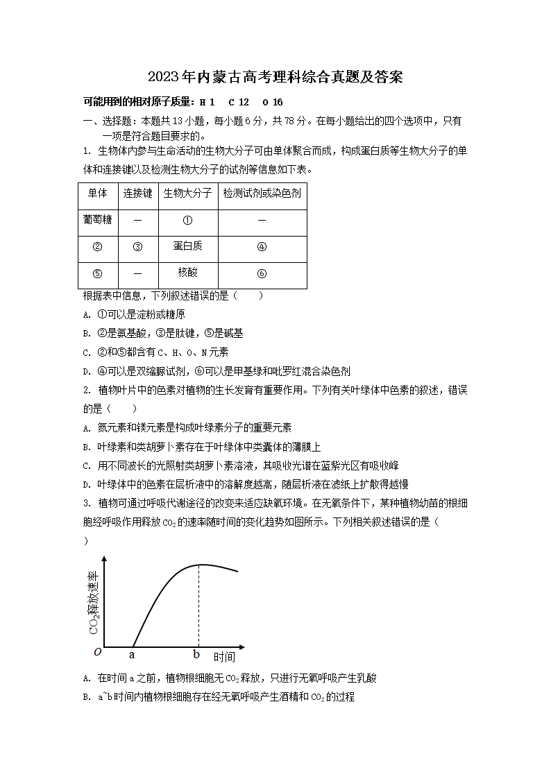 2023年内蒙古高考理科综合真题及答案(Word版)06-16