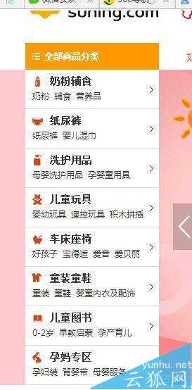 左侧导航,一般是为了弥补顶部导航而存在的,因为网站的每个栏目下面都会有很多详细的分类,这些分类不可能全部放置在顶部导航中,因此,需要采用左侧导航来进行弥补。如下图为苏宁电商的左侧导航: