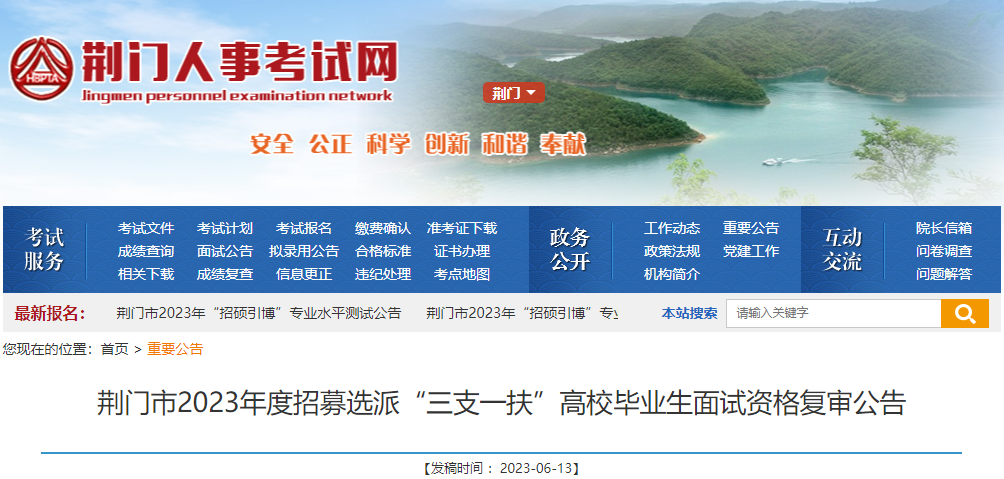 【#三支一扶# 导语】©文档大全网从荆门人事考试网了解到,2023年湖北荆门市招募选派“三支一扶”高校毕业生面试资格复审时间:6月20日,相关事宜如下: