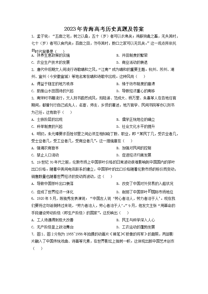 【文档预览】 文档大全网整理发布2023年青海高考历史真题及答案(Word版),前五页预览如下: