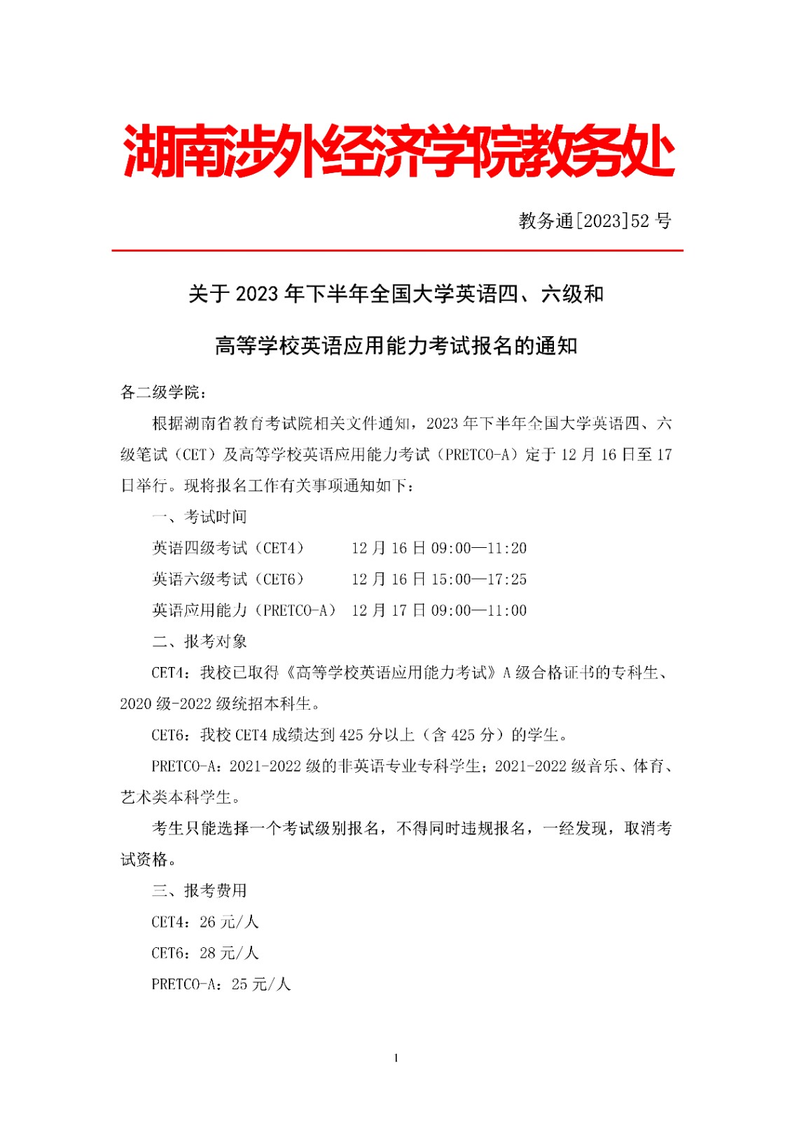 2023下半年湖南涉外经济学院英语四、六级和高等学校英语应用能力考试报名通知09-13