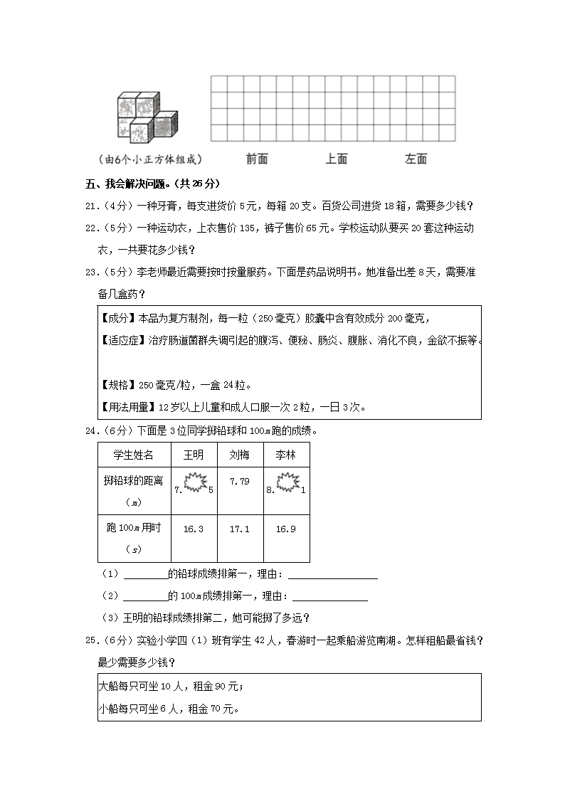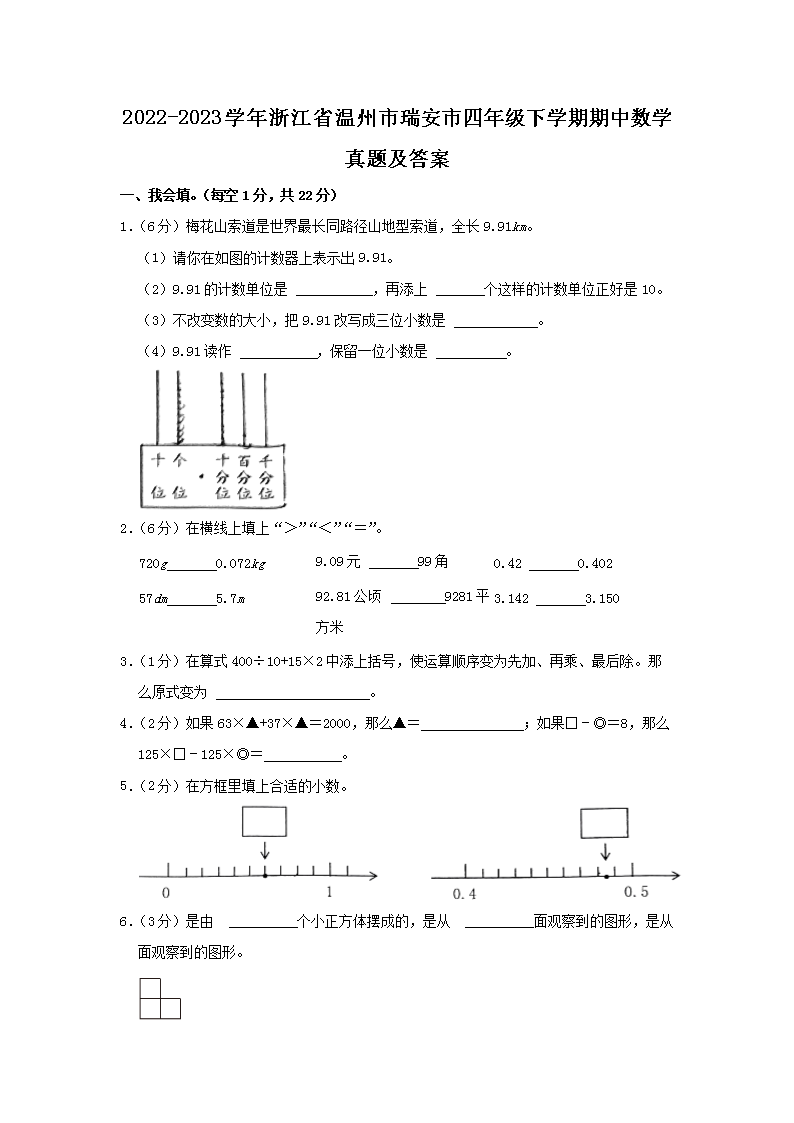 2022-2023学年浙江省温州市瑞安市四年级下学期期中数学真题及答案(Word版)10-09