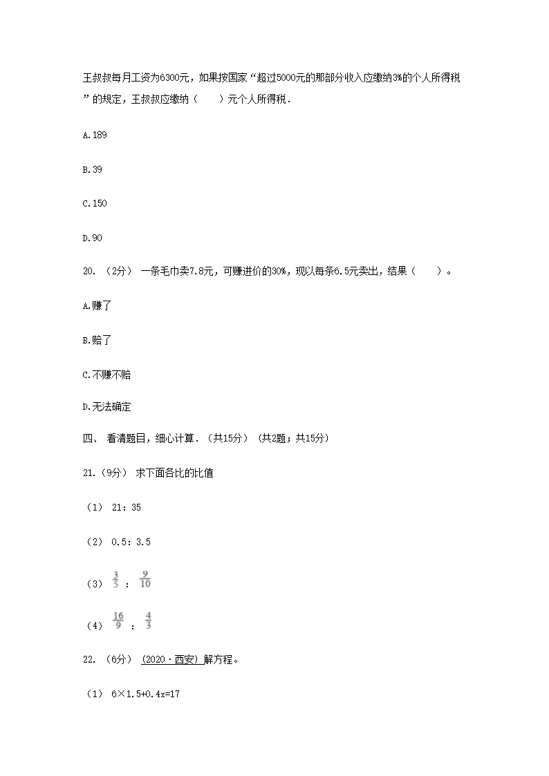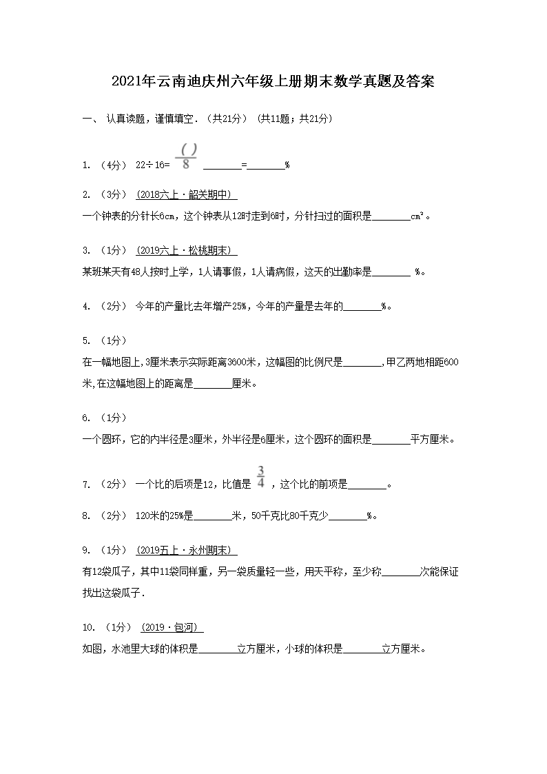 【文档预览】 文档大全网整理发布2021年云南迪庆州六年级上册期末数学真题及答案(Word版),前五页预览如下: