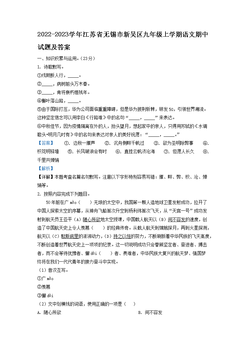 2022-2023学年江苏省无锡市新吴区九年级上学期语文期中试题及答案(Word版)09-12