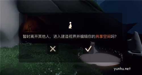 2、来到石像前的空地,就会出现一个光圈,点击那个打坐功能,就会弹出如下窗口提示“展示离开其他人,进入建造视界并编辑你的共享空间吗?”