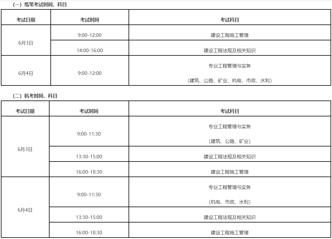 机考报考建筑工程、公路工程、矿业工程专业的考生只能在6月3日参加考试;报考市政公用工程、机电工程、水利工程专业的考生只能在6月4日参加考试。