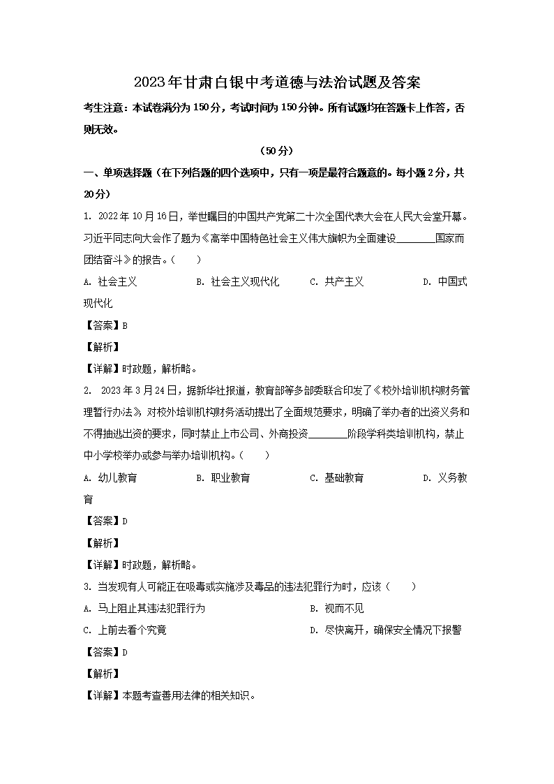 【文档预览】 文档大全网整理发布2023年甘肃白银中考道德与法治试题及答案(Word版),前五页预览如下: