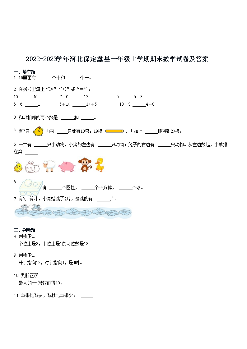 2022-2023学年河北保定蠡县一年级上学期期末数学试卷及答案(Word版)07-05