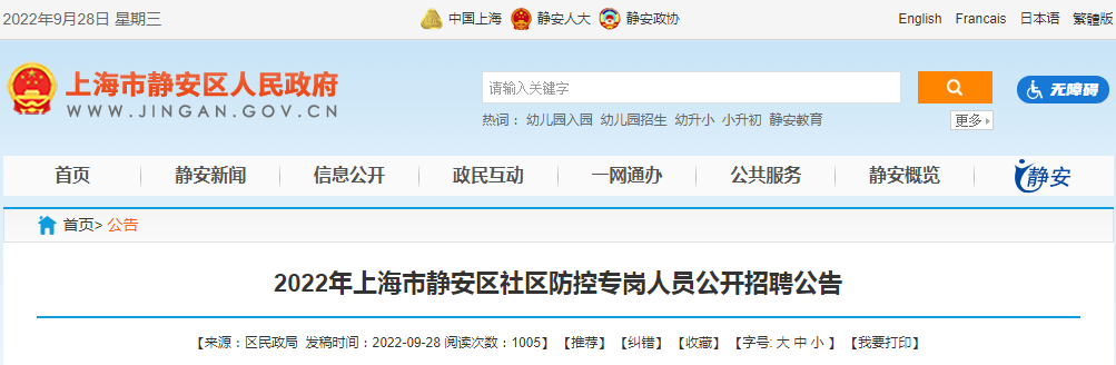 原文标题:2022年上海市静安区社区防控专岗人员公开招聘公告