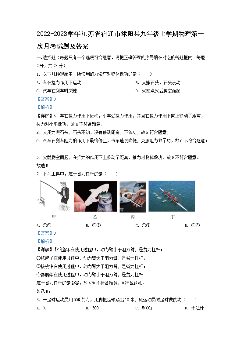 2022-2023学年江苏省宿迁市沭阳县九年级上学期物理第一次月考试题及答案(Word版)10-13