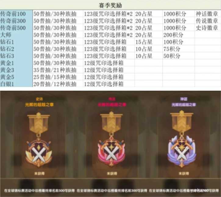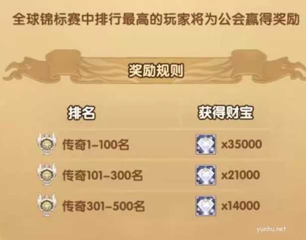 8.玩家在全球锦标赛总榜排名前500,在赛季结算后将获得包含大量钻石的财宝,一个赛季每个公会最多获得一份财宝,一个公会有多名玩家时取最高名次者为准。