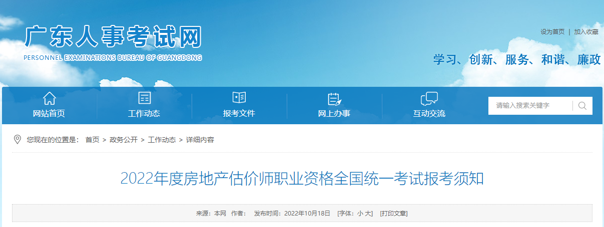 【#房地产评估师# 导语】®文档大全网从广东人事考试网获悉,2022年广东房地产估价师报考工作现已开始,报名时间:10月19日-24日,考试时间:11月12日-13日,更多事宜请参考阅读《考务通知》,官方公告原文如下: