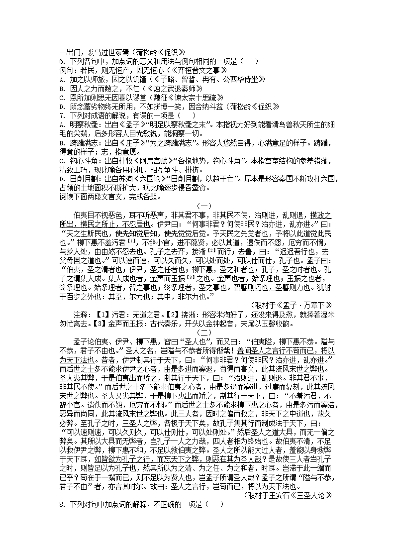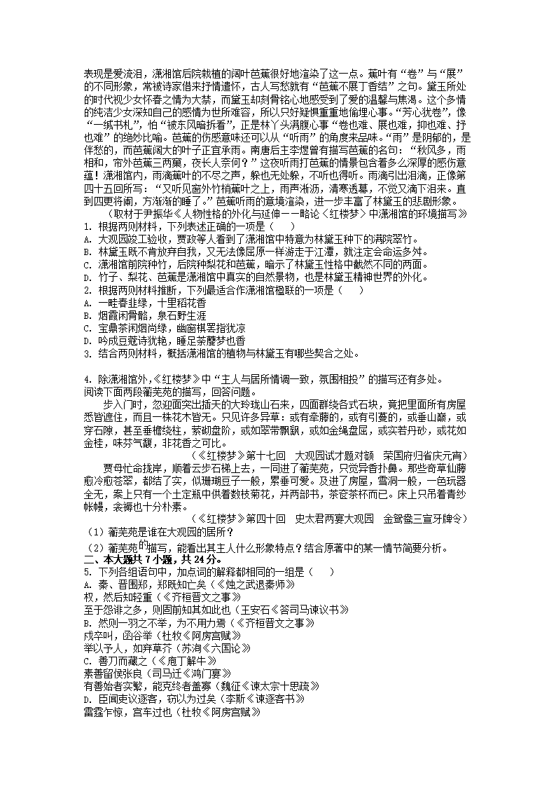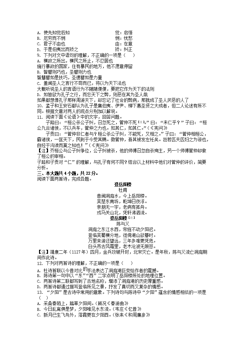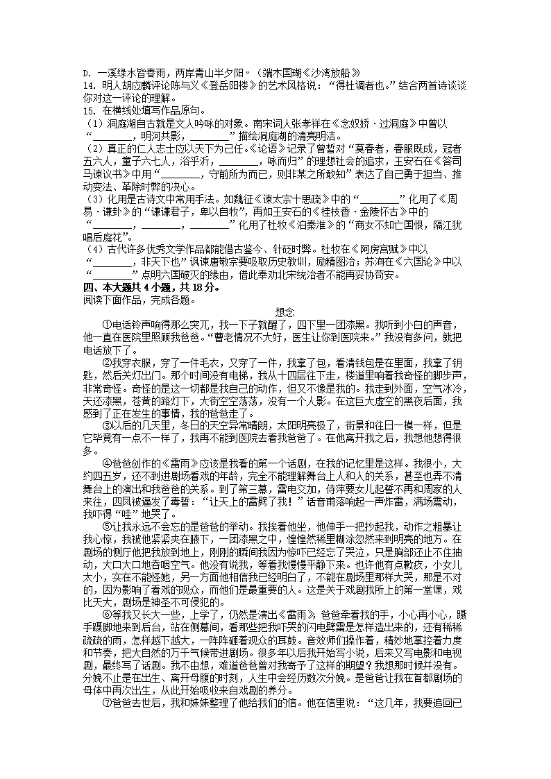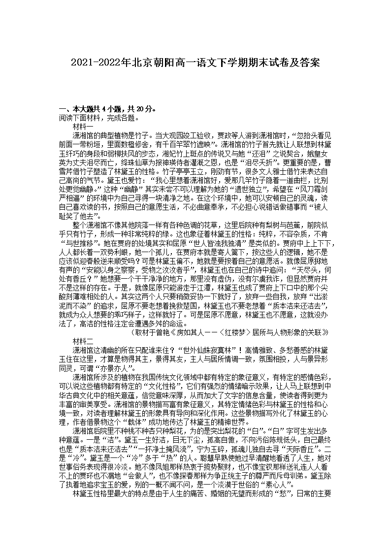 2021-2022年北京朝阳高一语文下学期期末试卷及答案(Word版)07-28