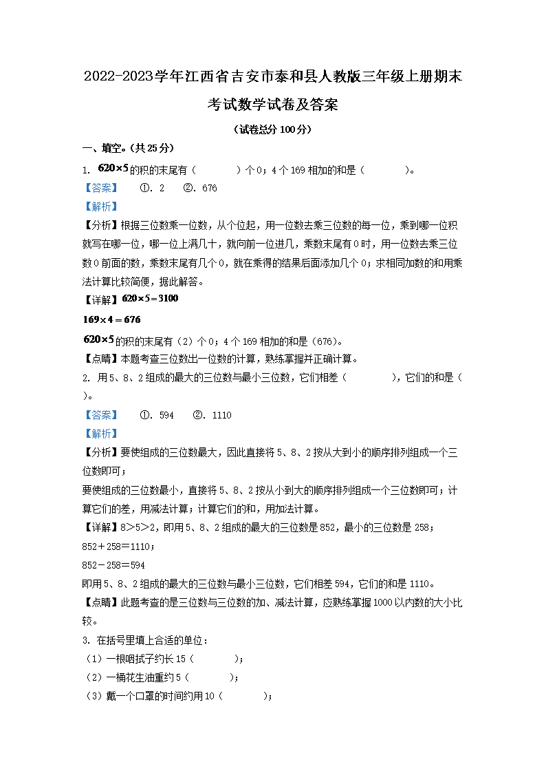【文档预览】 文档大全网整理发布2022-2023学年江西省吉安市泰和县人教版三年级上册期末考试数学试卷及答案(Word版),前五页预览如下: