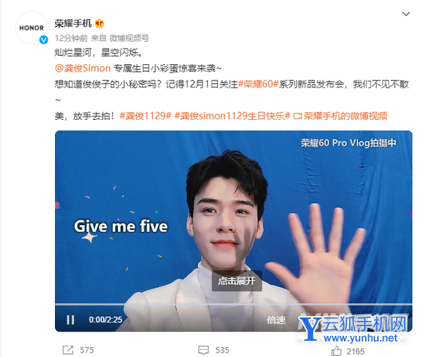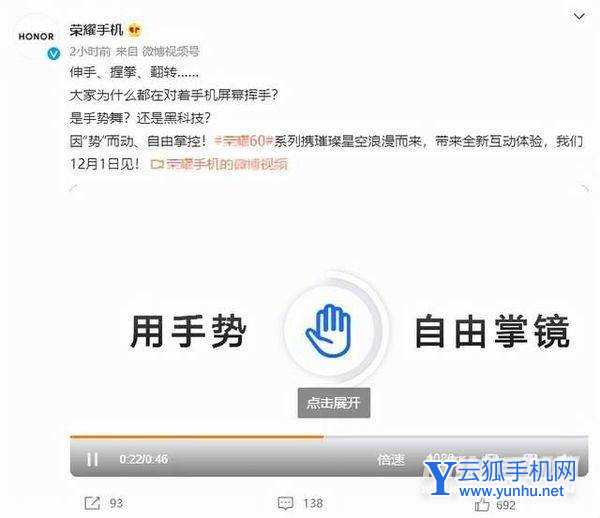 荣耀手机官方微博发布了一条龚俊拍摄的Vlog视频,这条Vlog就是用即将发布的荣耀60 Pro拍摄的,Vlog的开头就对新机将要带来的隔空手势功能进行了预告。