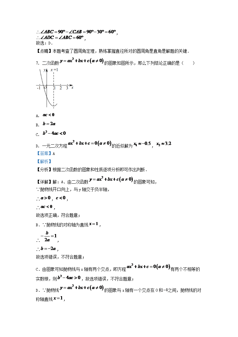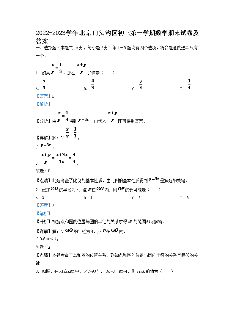 2022-2023学年北京门头沟区初三第一学期数学期末试卷及答案(Word版)08-09
