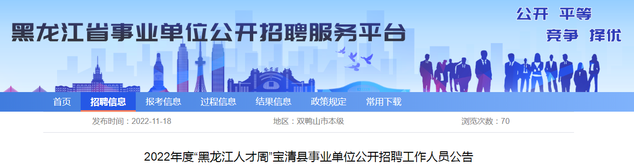 在黑龙江省事业单位公开招聘服务平台(http://gkzp.renshenet.org.cn)、宝清县人民政府门户网站(http://www.hlbaoqing.gov.cn/)和微看宝清微信平台发布《2022年度“黑龙江人才周”宝清县事业单位公开招聘工作人员公告》。