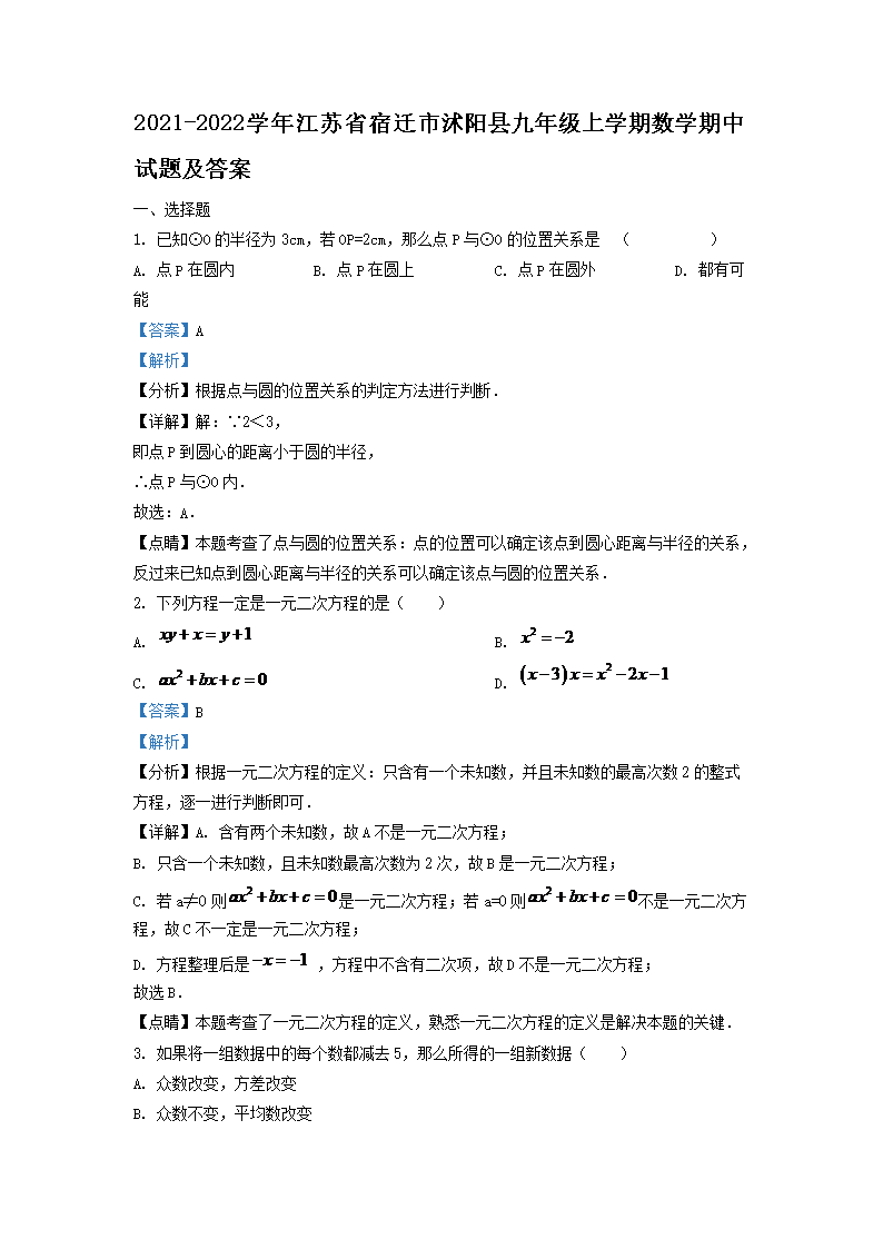 2021-2022学年江苏省宿迁市沭阳县九年级上学期数学期中试题及答案(Word版)09-28