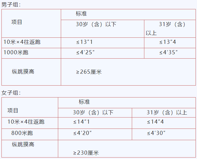 3.体能测试项目和标准:参照《关于印发公安机关录用人民警察测评项目和标准(暂行)的通知》(人社部发[2011]48号)的标准进行。具体如下: