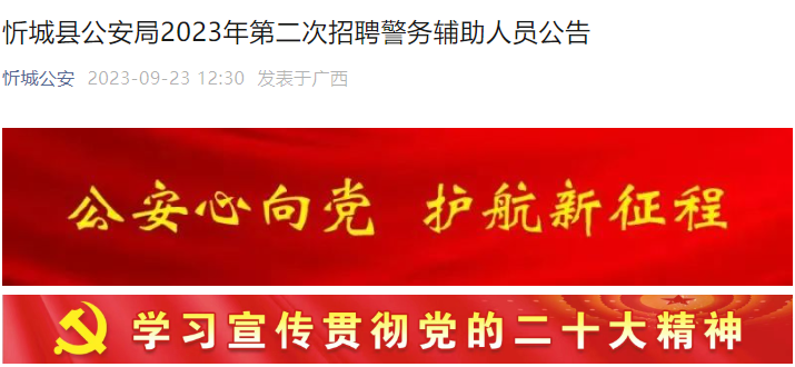 【#招警考试# #2023年第二次广西来宾忻城县公安局招聘警务辅助人员公告(14名)#】®文档大全网从忻城公安获悉,2023年第二次广西来宾忻城县公安局招聘警务辅助人员14名。报名时间:9月25日-10月13日,考试时间:另行通知,更多事宜请参考阅读《招聘公告》,官方公告原文如下: