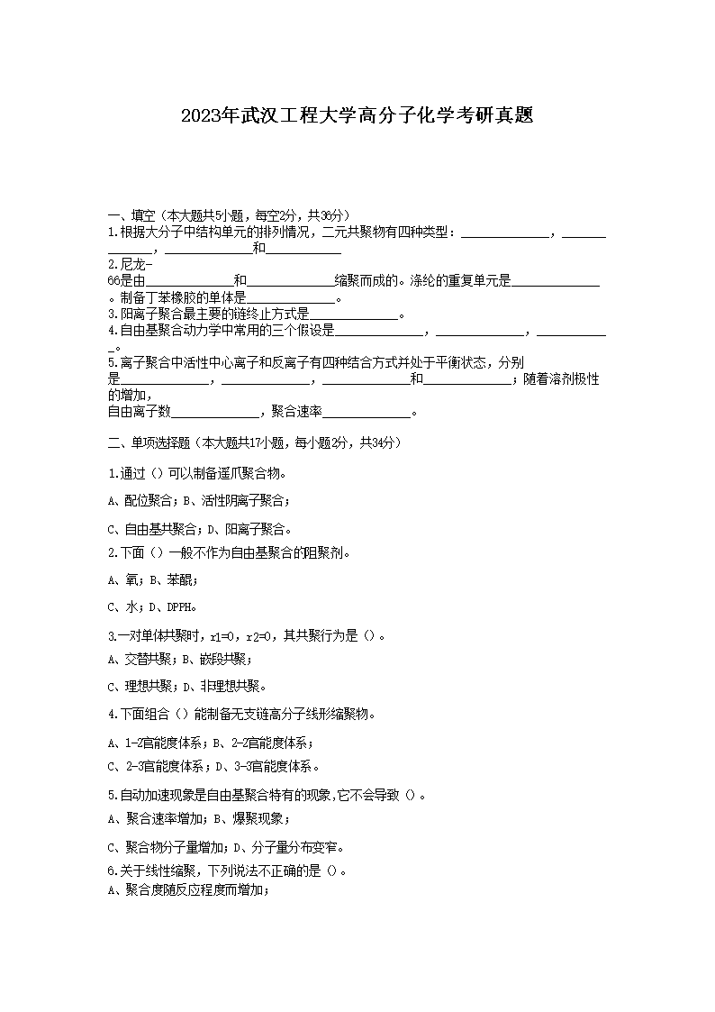 2023年武汉工程大学高分子化学考研真题(Word版)10-13