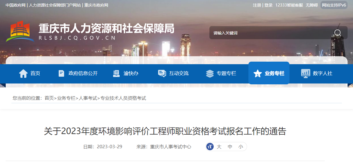 2023年重庆环境影响评价工程师报名时间:2023年3月30日9:00至4月6日17:00,报名工作采用网上报名的方式,报名网站“中国人事考试网(www.cpta.com.cn)”。