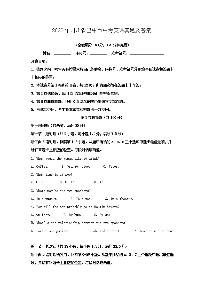 【文档预览】 文档大全网整理发布2022年四川省巴中市中考英语真题及答案(Word版),前五页预览如下: