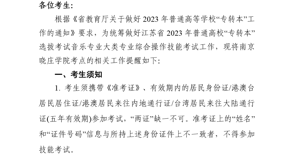 江苏省2023年普通高校“专转本”选拔考试音乐专业大类专业综合操作技能考试考前提醒03-30