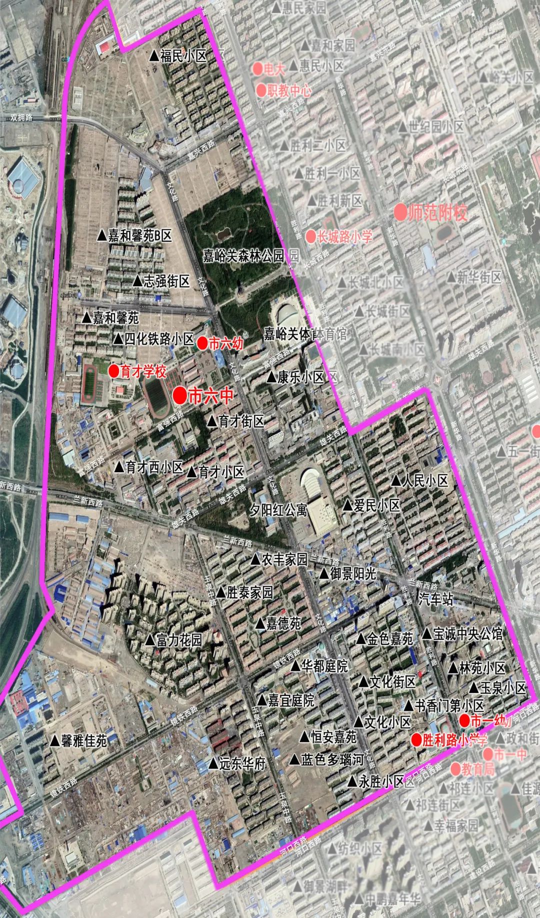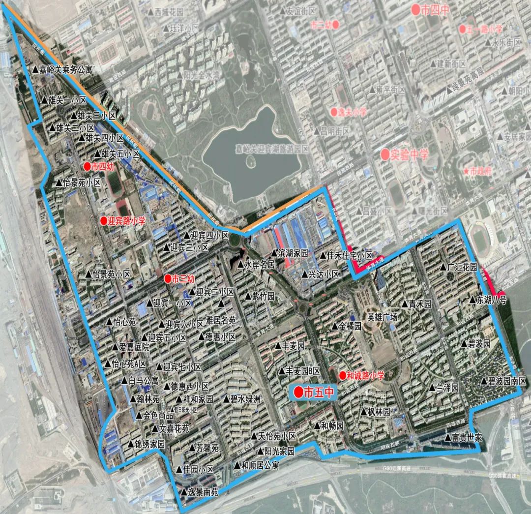 5.师范附校:兰新路以北,新华路-胜利路以东,包括长城街区、胜利街区、新华街区、五一街区、文化局家属区、安环小区、中天-清怡园、长城小区、胜利小区、兰新北街区、利民街区、峪关街区、大众街区、益民街区、惠民小区、惠民家园、嘉和家园、峪泉镇、嘉北工业园区内零散住户。