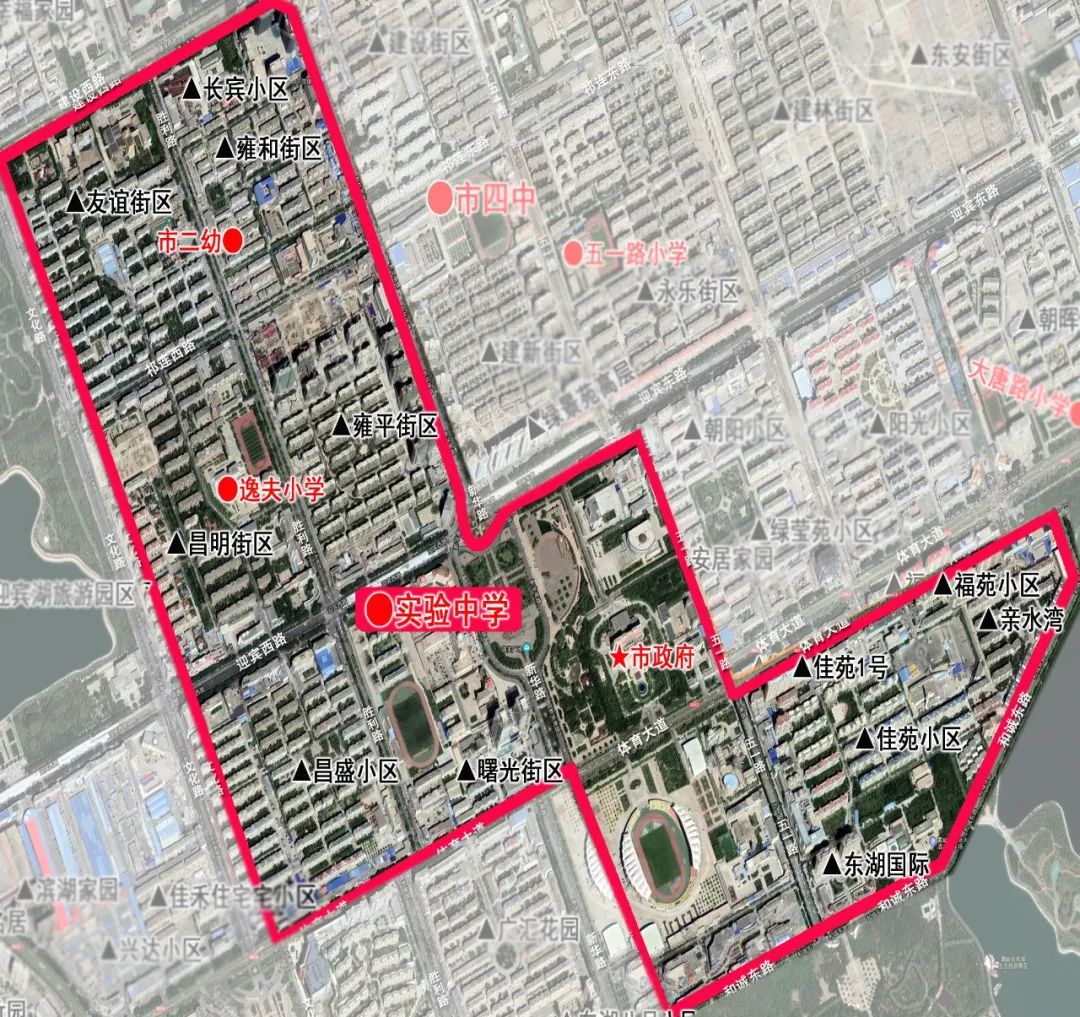 4.实验中学:建设西路以南,新华路以西,文化路以东,包括雍和街区、雍平街区、友谊街区、长宾小区、昌明街区、昌盛街区、曙光街区、佳苑小区、东湖国际、佳苑壹号、福苑小区、亲水湾小区。