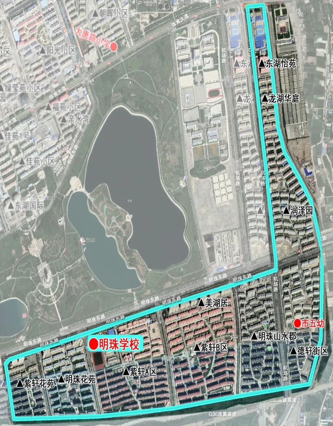 6.明珠学校(初中部):明珠东路以南,机场路以东,高速公路以北,包括大学城周边、润泽园、紫轩花苑、美湖居、明珠花苑、紫轩AB区、东湖怡苑、龙庭苑、龙湖华庭、德轩小区、明珠山水郡。
