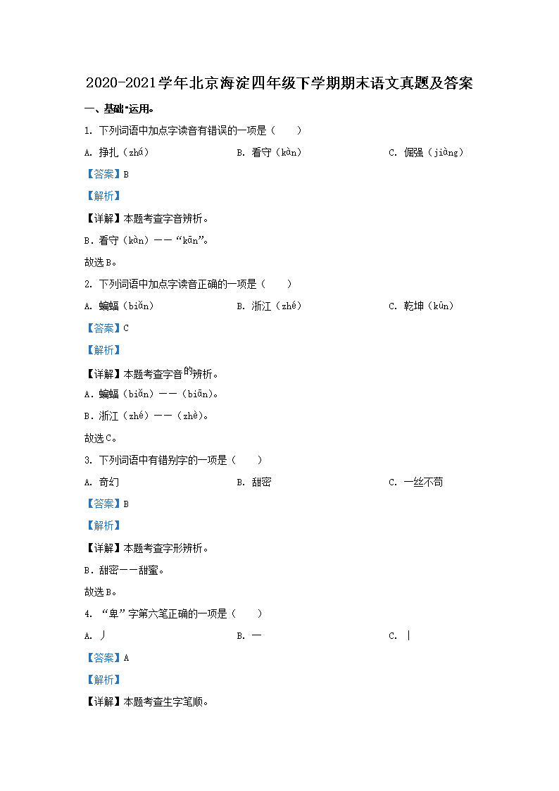【文档预览】 文档大全网整理发布2020-2021学年北京海淀四年级下学期期末语文真题及答案(Word版),前五页预览如下: